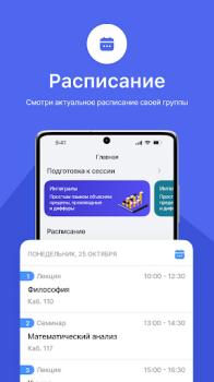 Интерфейс продуман до мелочей: цвета и иконки помогают быстро ориентироваться в днях недели, а смена недели происходит автоматически. Расписание легко редактировать — можно удалять, переносить или дублировать занятия. Также поддерживается режим сессии — для тех, у кого расписание полностью меняется на экзаменационный период.