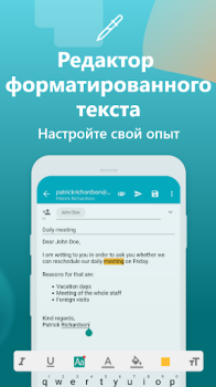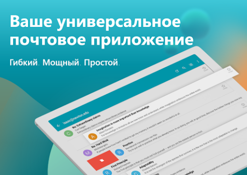 Aqua Mail — это удобное почтовое приложение для Android, созданное для тех, кто хочет иметь под рукой все свои письма, не зависеть от одного сервиса и работать с почтой быстро и без лишней суеты. Оно подойдет как тем, кто получает пару писем в день, так и тем, кто активно ведет переписку, работает с вложениями и пользуется несколькими почтовыми ящиками. Aqua Mail позволяет подключить практически любой почтовый сервис, будь то Gmail, Яндекс.Почта, Mail.ru или корпоративная почта. Всё просто: установили, ввели данные, и почта сразу у вас на экране.