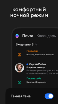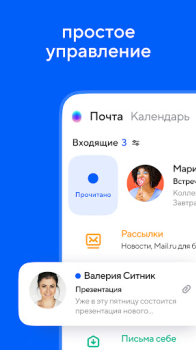 Mail.ru — это простое и удобное приложение для электронной почты, которое подходит как для личной, так и для деловой переписки. Оно создано для тех, кто хочет быстро читать, отправлять и организовывать письма без лишней суеты. Интерфейс понятный, всё находится под рукой, а сама работа с почтой не вызывает трудностей даже у тех, кто раньше не пользовался мобильными почтовыми клиентами. Это приложение станет хорошим помощником для повседневных задач, позволяя всегда быть на связи и ничего не пропускать.