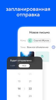 Интерфейс приятный и понятный: крупные кнопки, логичное расположение элементов и быстрая навигация. Приложение работает плавно даже на не самых новых устройствах. Поддерживаются вложения всех основных форматов — фото, документы, архивы и другое. Если письмо пришло с файлами, их можно сразу открыть или сохранить на телефон.
