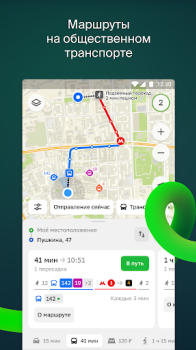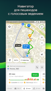 - Интуитивно понятный интерфейс. Приложение обладает удобным и простым в использовании интерфейсом, поэтому пользоваться им могут и пожилые люди, и подростки. Может работать в фоне, есть голосовое ведение. Поиск пути для пешеходов работает в десятках крупных населенных пунктов.