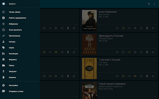 ReadEra поддерживает все распространенные форматы: EPUB, PDF, MOBI, FB2, DOC, RTF и многие другие. Вы можете: