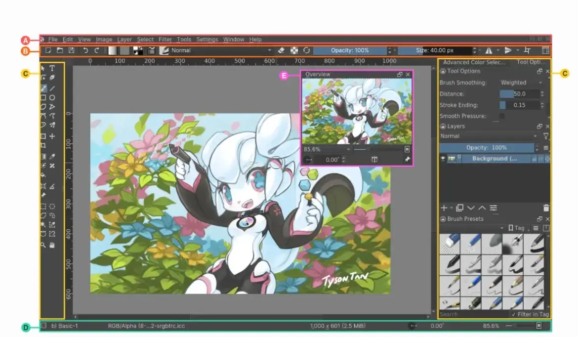 Krita | Растровая | Средний | Бесплатно | Есть | Поддержка анимации | Windows 7 и выше, macOS, Linux |