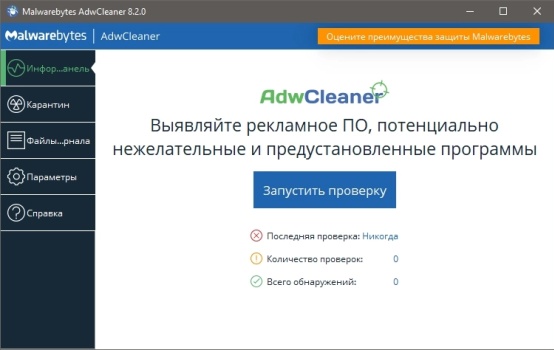 Бесплатная русскоязычная утилита Adw Cleaner качественно очищает систему от нежелательных файлов и программ, а минимальный набор рабочих инструментов оптимизирует управление софтом.
