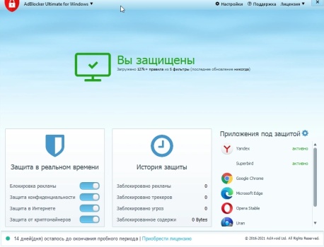 Помимо нежелательной рекламы, AdBlocker Ultimate также блокирует сторонний трекинг, подозрительные процессы, фишинговые сайты, программы-вымогатели и все прочее, что может нанести вред конфиденциальности личных данных и безопасности компьютера.