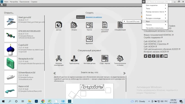 - Из преимуществ Компаса так же стоит выделить то, что весь интерфейс выполнен на русском языке. Это невероятно удобно для начинающих, позволяет быстрее освоить программу.